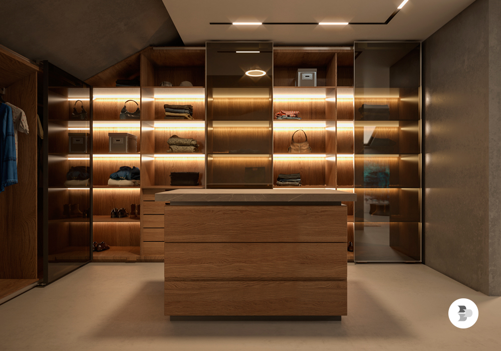 Mistura de áreas abertas e fechadas para exibir itens decorativos e organizar roupas.