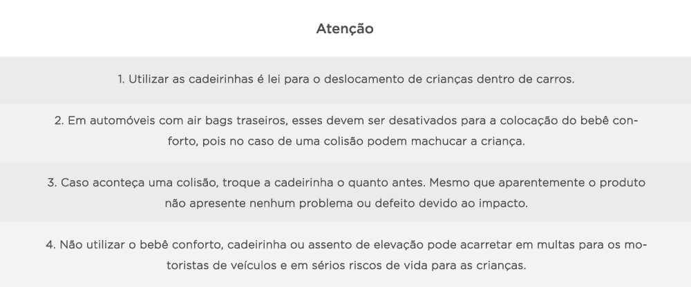 O bebê conforto é restrito para crianças até 13 kg e conforme o crescimento do pequeno você deve ir ajustando esse item no seu carro. Entre um e quatro anos da criança, a cadeirinha infantil é a mais indicada, e depois dessa idade é necessário aderir ao assento de elevação até que ela complete seta anos.