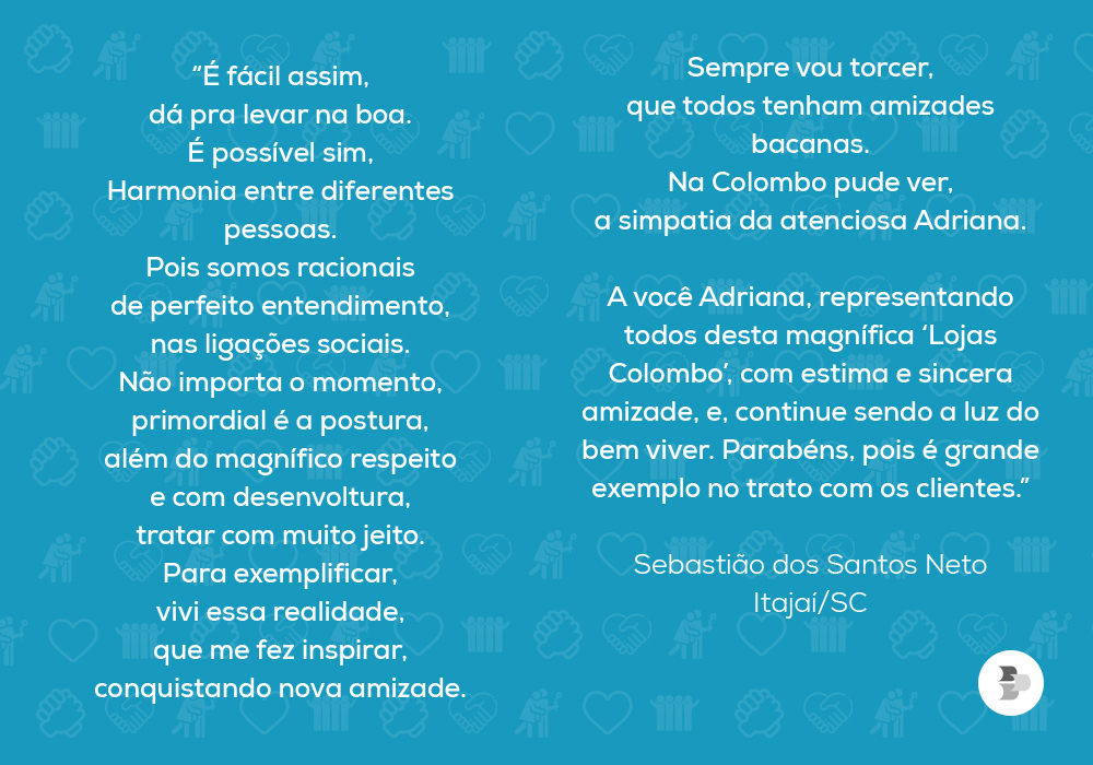 Adriana Bertoni, Consultora de Serviços da Colombo, auxiliou o cliente Sebastião Neto, da cidade de Itajaí/SC, na hora de fazer um empréstimo. O consumidor ficou tão grato com o atendimento, que retornou à loja e presenteou Adriana com um poema <3