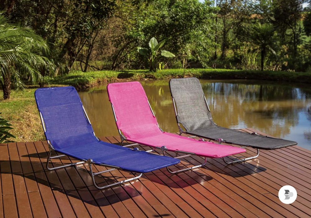 Por fim, vamos falar da espreguiçadeira. Esse produto é muito comum ao lado das piscinas ou na própria praia. Por ter um tamanho maior, ela serve para o descanso e exposição longa ao sol.