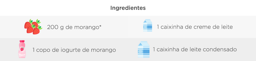 - Em um liquidificador, misture todos os ingredientes: morangos (cortados em pequenos pedaços), leite condensado, creme de leite e o iogurte de morango. Bata até virar um creme homogêneo.