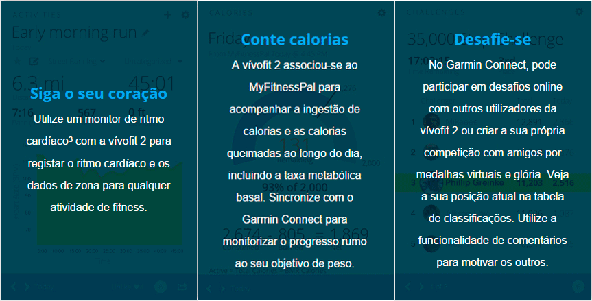 A Vivofit aprende o seu nível de atividade atual e, em seguida, atribui um objetivo diário atingível. À medida que alcança os seus objetivos, a Vivofit ajusta o seu objetivo para o dia seguinte, aproximando-o gradualmente de um estilo de vida mais ativo. No Garmin Connect, você pode ganhar medalhas virtuais e consultar o seu progresso por dia, semana ou mês.